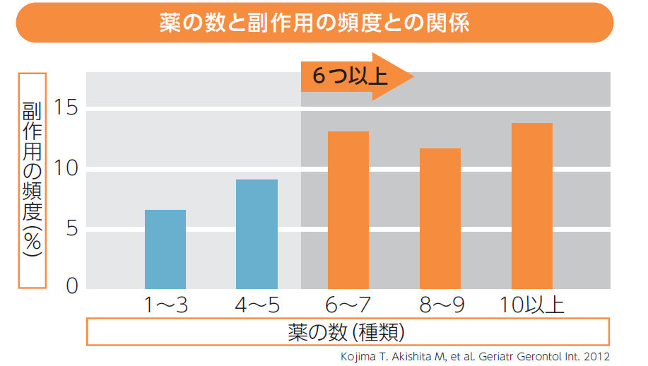 この様に年齢が上がるにつれ飲んでいる薬が多いデータがあります。75歳以上になると40%以上の人が5種類以上薬を飲んでいます。(図①)高齢者になると持病や体の痛み・不調などで通院・処方薬が増えてしますのでしょう。しかし、薬は良い効果だけでなく副作用の出る可能性もあり、飲んでいる薬が多ければ多いほど有害事象のでる確率が上がります。(図②)