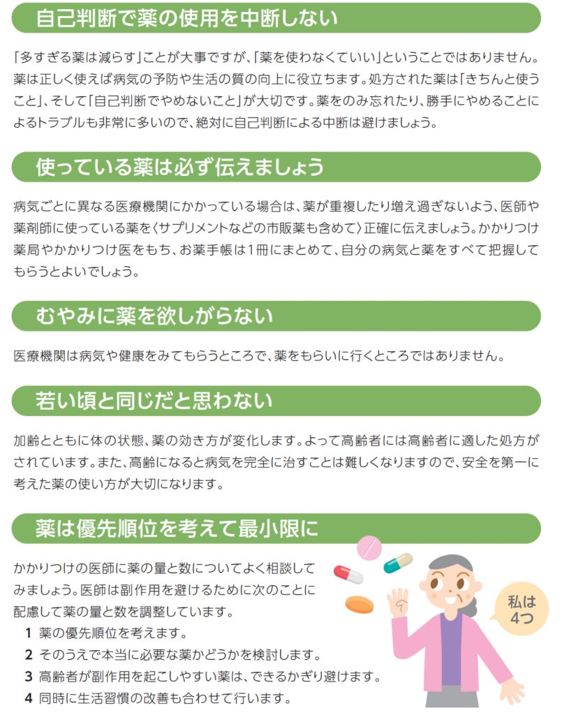 この際、本当に必要な薬と必要性の低い薬をしっかり理解して、減らせる薬は医師と相談して減らしていきましょう。そうすれば体やお財布への負担を減らして安全に服用を出来るでしょう。分かりやすい参考資料を添付致します↓