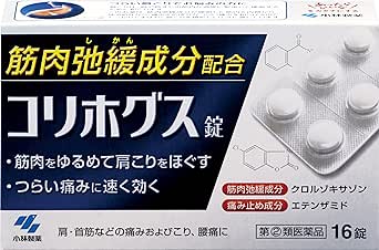 肩こり・腰痛の薬 By いずみ薬局2024年8月23日上 コリホグス錠 16錠 販売価格:¥1,000(税込) 区分:指定第2類医薬品 効能・効果:肩・首筋などの痛みおよびこり、腰痛、背痛、ねんざ、うち身、神経痛・リウマチ性疼痛、四十肩、関節痛、筋炎、腱炎。